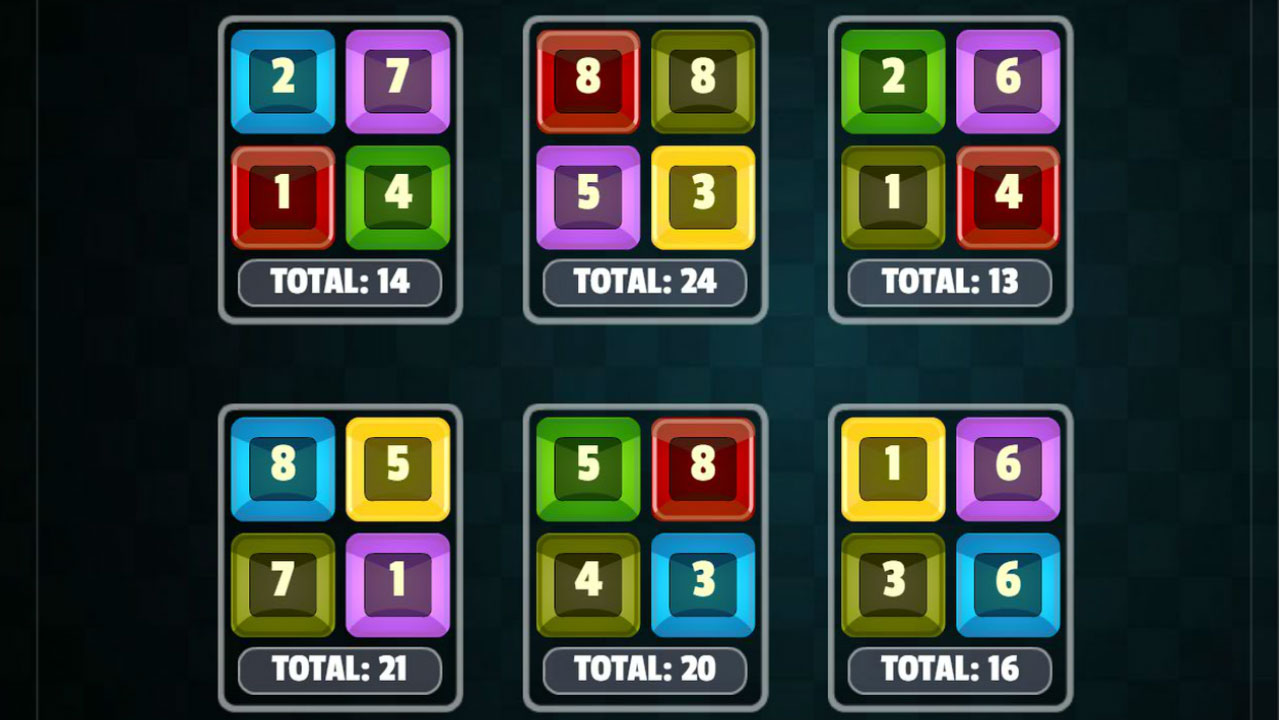 Each level has boxes with numbers in them. There is a target number listed at the top. Move numbers from one box to another, so that the sum of the numbers in each box matches the level`s target number. Swap numbers by clicking one number in one box and then another number in the other box.